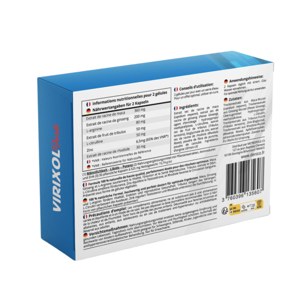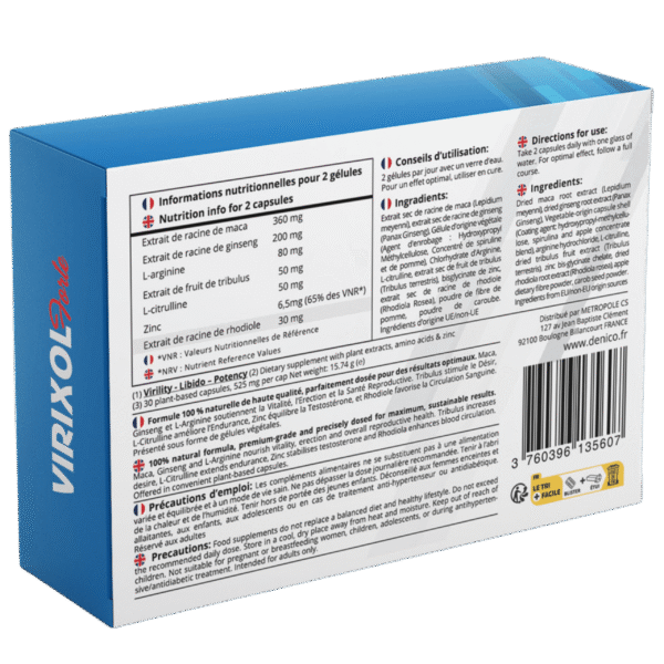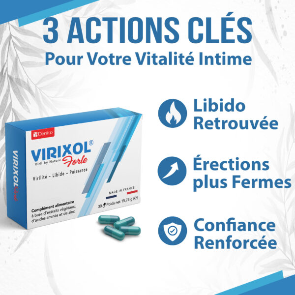 Virixol Forté® est un complément alimentaire 100 % naturel spécialement formulé pour les hommes à partir de 35 ans qui souhaitent renforcer leur libido, améliorer leurs performances intimes et retrouver des érections fermes et durables. Élaboré à partir d’actifs végétaux reconnus pour leur efficacité, ce booster masculin associe la Maca du Pérou, le Ginseng rouge, le Tribulus terrestris, la L-Arginine et le Zinc, dans une synergie puissante et durable.