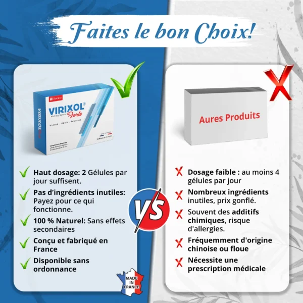 🌱 Grâce à sa composition végétale et sans OGM, Virixol Forté® convient aux hommes attentifs à leur santé. Il peut s’utiliser en cure ou ponctuellement, selon les besoins.